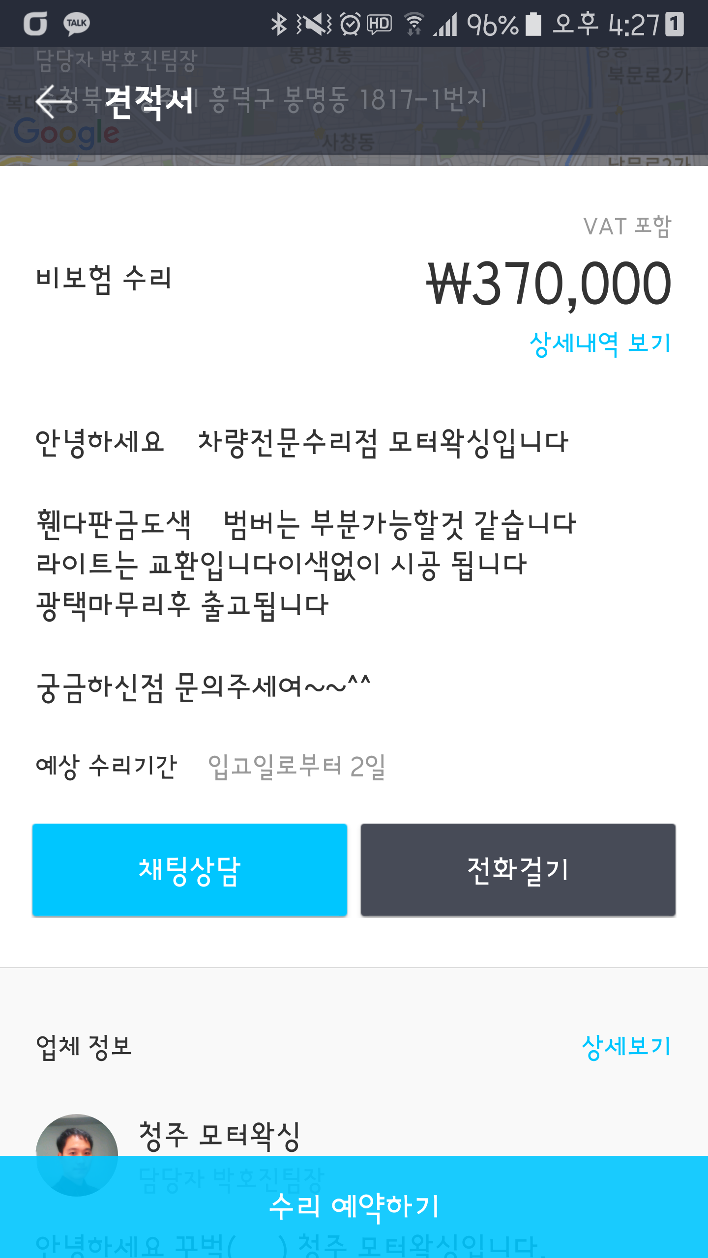 카닥에서 수리견적 요청해서 받은가격인데 이정도면 적당한편인가요?