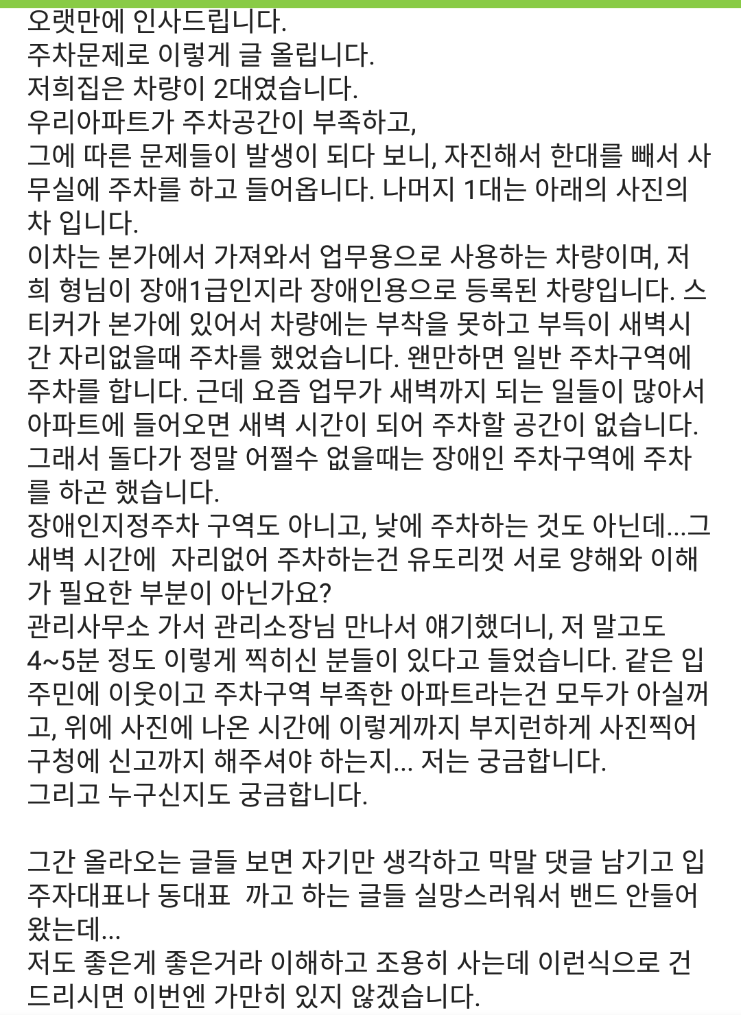 장애인이 아니면 일반주차구역에 주차하는것이 기본인데 막줄에는 협박까지ㅎㅎ |