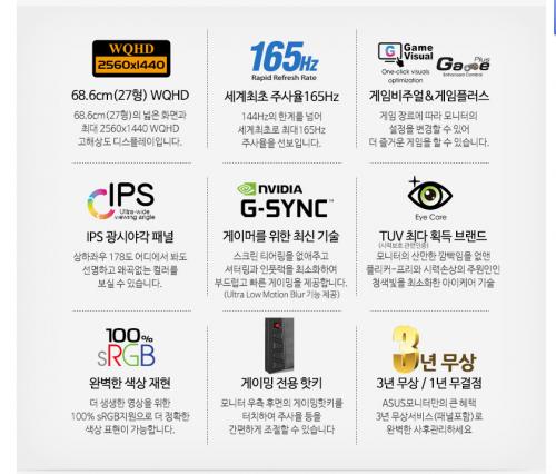 27인치, QHD, 144Hz(165Hz), 지싱크, IPS, 응답속도 4ms