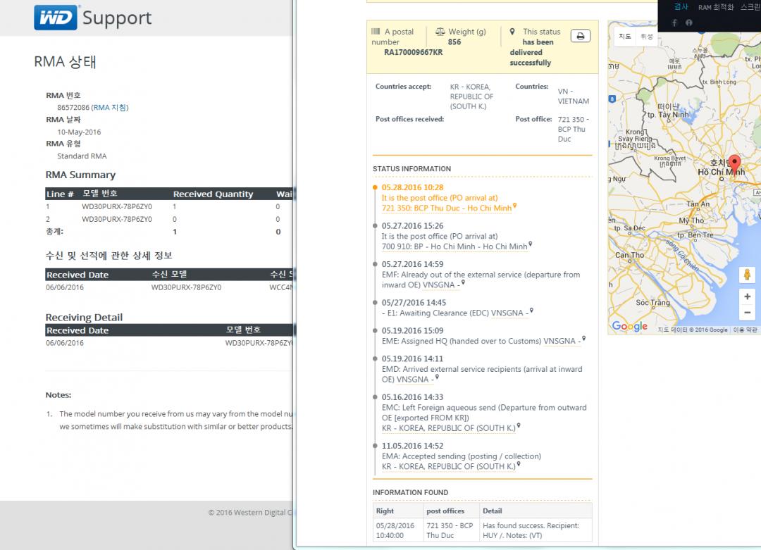 베트남 사서함도착후 일주일후에 웨스턴디지털rma상태에 받음으로 기록되네요.