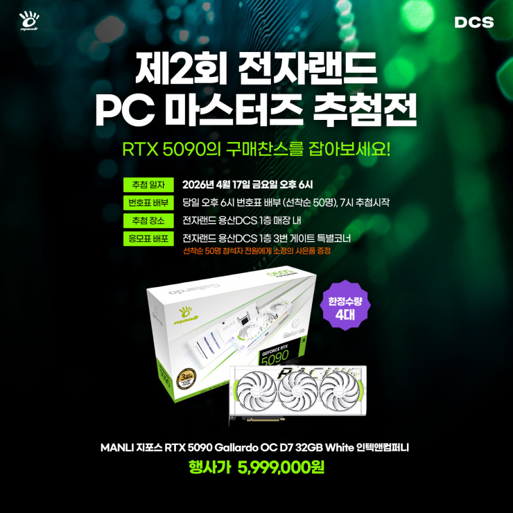 5090 구하려고 몇 달째 알아보고 있었는데 오늘 전자랜드 용산DCS에서 MANLI RTX 5090 Gallardo OC D7 32GB White 추첨 판매 한다는 글을 봤어요