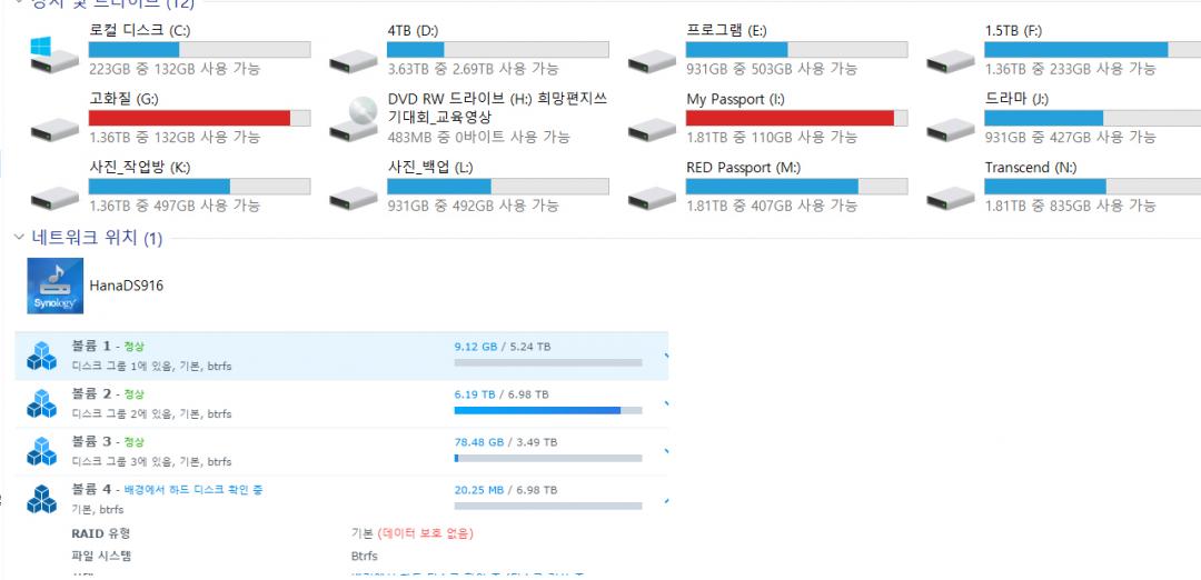 916+에는 HGST 6T,4T / 시게이트 8T 2개로 26TB로 운용하게 되었네요. 실용량이야 좀 줄지만...