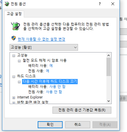 하드디스크 끄기도 사용안함으로 해두었는데도 이렇습니다.