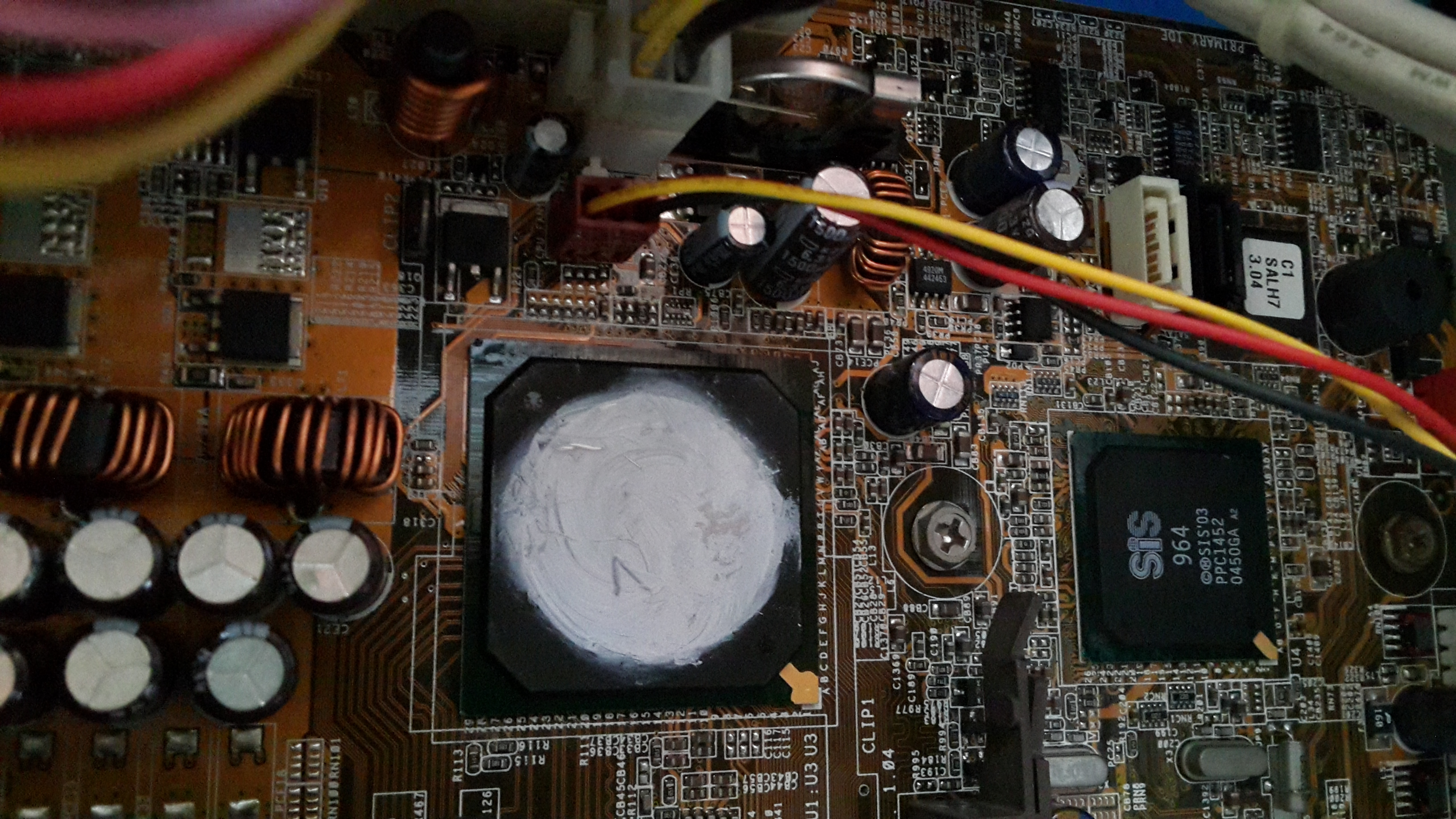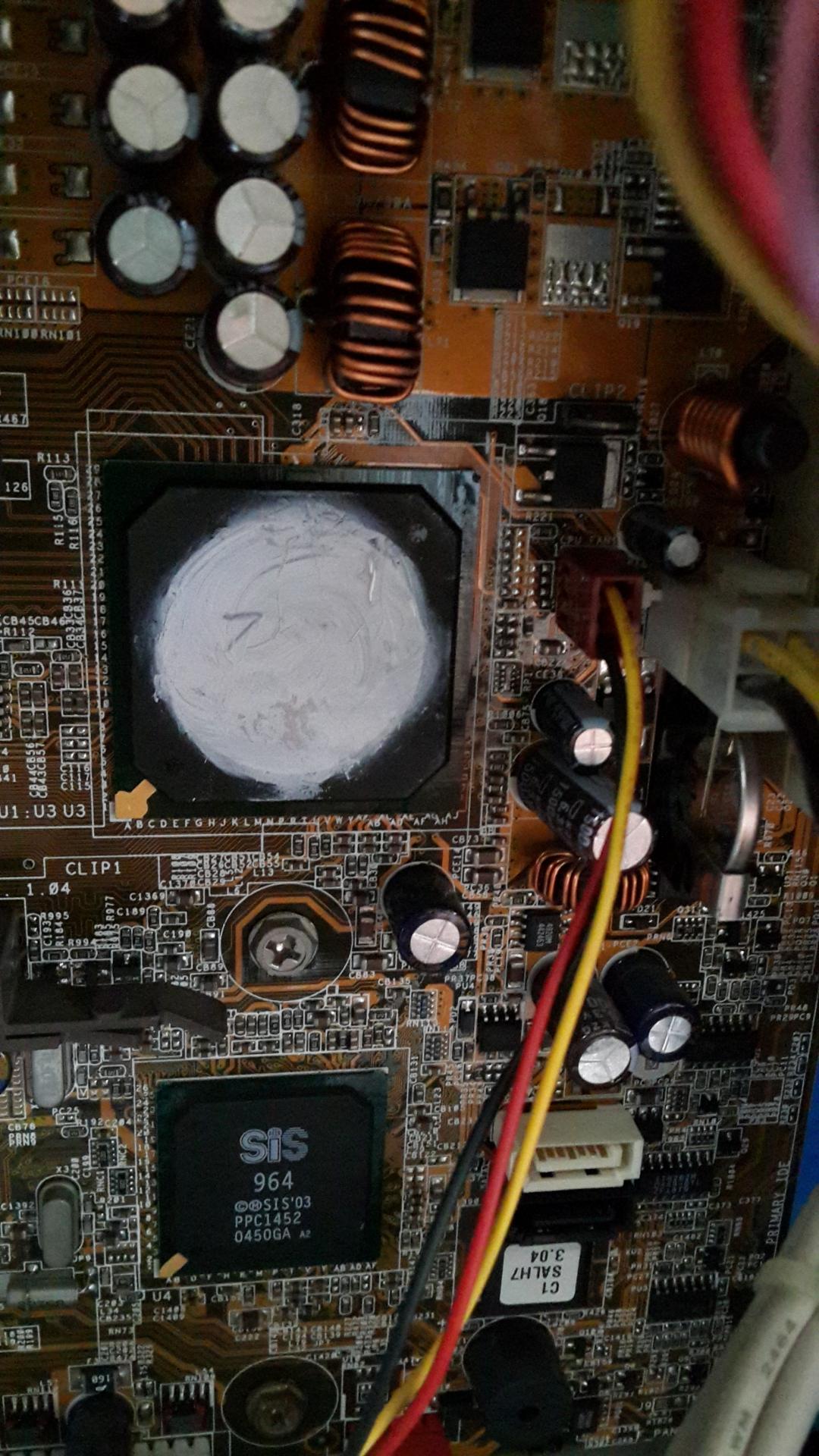 서멀 컴파운드 쓰시려면 사진의 CLIP1 부품이 있어야 걸쇠 걸어서 방열판이 안떨어지게 할 수 있는데, 저 부품 없어서 쓸 수가 없습니다. 오래된 보드에서는 종종 있는 현상입니다. 서멀 컴파운드는 본드가 아니라서 사진처럼 떨어집니다.