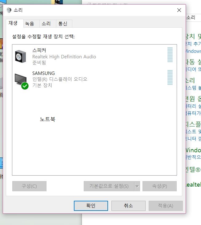 노트북과 연결시 삼성 이라 뜨고 삼성 티비에서 소리도 같이 출력이 되었습니다.
