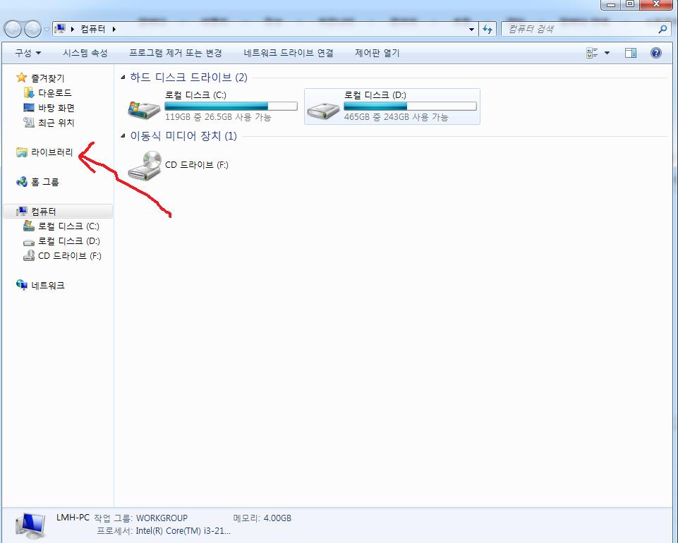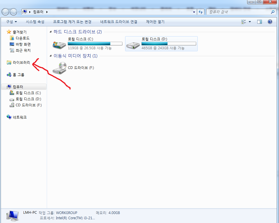 내컴퓨터가 안뜨고 빨간화살표가 가리킨 라이브러리가 열리네요