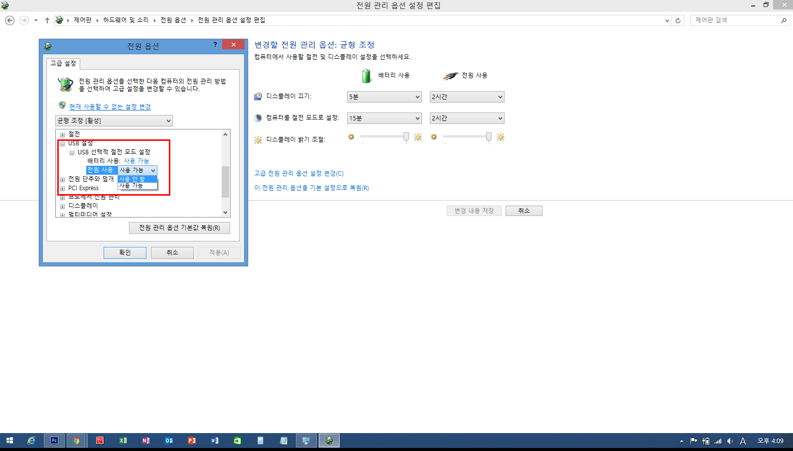 2. 포트를 옮겨도 해결되지 않을 경우, 제어판의 전원 옵션에 가서 USB 선택적 절전모드 사용안함 설정을 해준다.