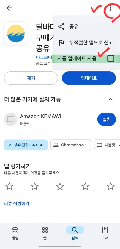 3. 설치이후에 play스토어에서 딜바다 검색후 자동업데이트 해제합니다.