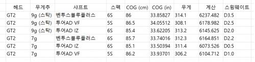무게추와 샤프트 변경에 따른 (특히 무게추) 스윙 느낌이 확연하게 차이 나던 것이 떠올라 스윙웨이트 계산을 해봤습니다