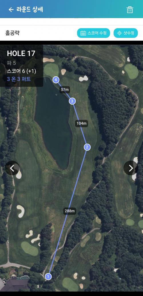 그러다 얼마전 부터 조금 잘 맞기 시작해다가 이번 주말은 몸 안풀린 첫3홀 빼곤 아주 잘 맞더군요. 230은 꾸준히 스트레이트 또는 페이드로 뽑아주다가 마지막 17번홀 기회의 파5에서 내리막 + 뒷바람 버프 덕에 288미터를 기록하였습니다.