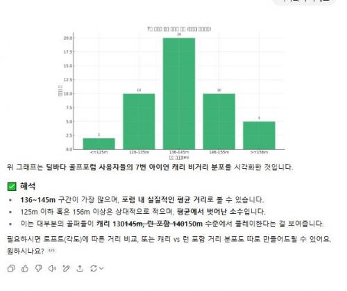 딜바다 골프포럼의 "다들 7번 아이언으로 몇 m 정도 치시나요?" 글에 달린 총 51개의 댓글을 분석하여 통계적으로 요약하면 다음과 같습니다: