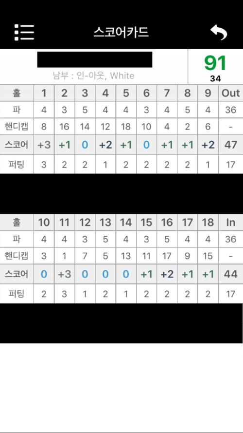 오늘 용인 남부 CC 12:44 티오프갔다가 캐디님이 작성한 스코어 카드에 88타, 제가 앱으로 적은 스코어 카드에 91타 치고 왔습니다. ㄷㄷㄷㄷㄷㄷㄷ