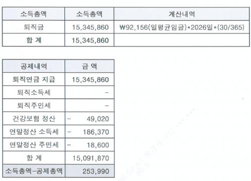 회사에 메일을 보내 전달받은 퇴직금 정산내역입니다.