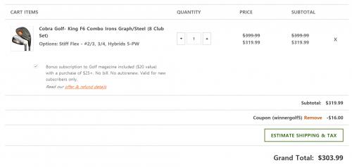 코브라 F6 6아이언 + 2유틸 세트를 399 달러에 팔고 있는데 이게 20퍼 할인에 5퍼 쿠폰코드까지 먹이면