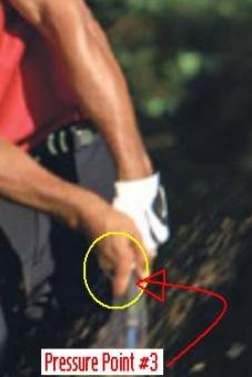 타이거우즈의 임팩지점 사진인데, 이 때의 왼손모양을 봐도, 적극적으로 힘을 쓰는 오른손이 궤도에 머물러 있도록 유지해주는 느낌이지요..