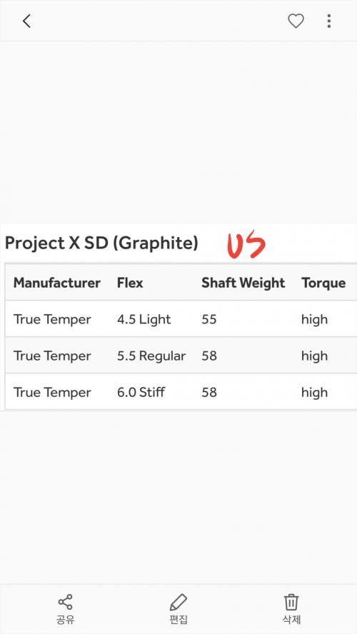 사진은 xr유틸 스탁샤프트 제원인데 플렉스별 무게를 보시면 됩니다.