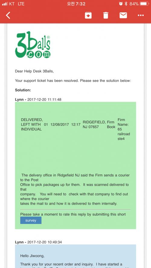 "USPS 에서 배송완료 했다고 한다. 아마 니네회사 내부 메일 분배쪽에서 문제가 생긴것같다." 하고있고,