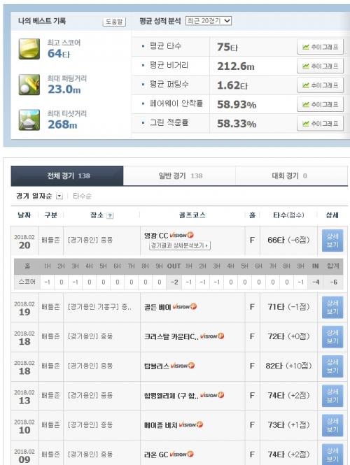 아래는 최근 20경기 스크린골프 성적표...