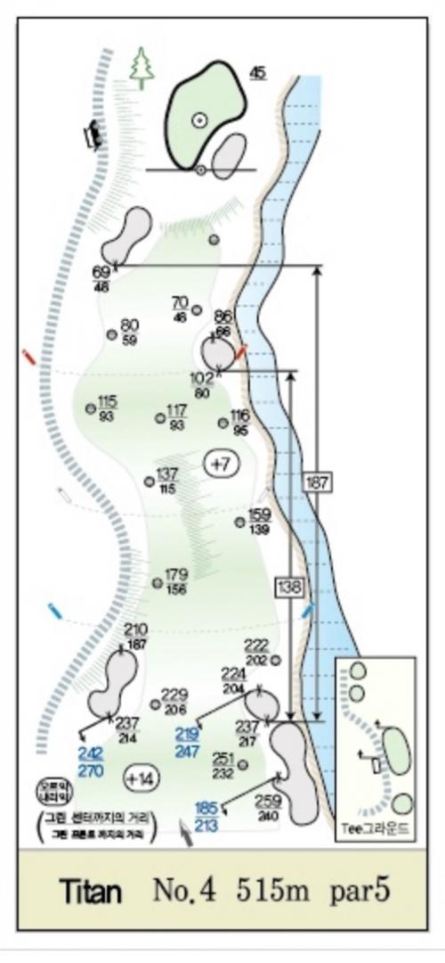 선수용은 구석구석 거리가 나와있는데, 저는 레이저거리측정기을 쓰니까 그정도는 필요없고, 대신 드라이버 랜딩존의 폭, 경사, 위험지역 이런걸 표시하고, 세컨샷을 어떻게 가져갈지를 미리 메모해 놓으면 나중에 실전에서 공략에 써먹을 수 있겠다 싶습니다.