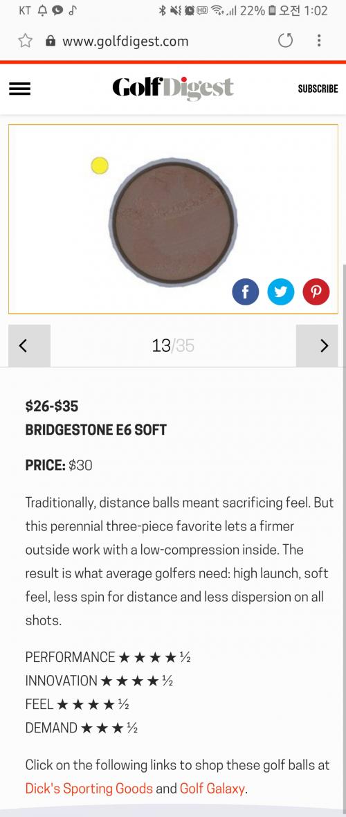 저는 브리지스톤 e6이 주력으로 쓰는 공입니다. 좋아요. 거리 잘나가고 그린에서도 잘 서고. | ||