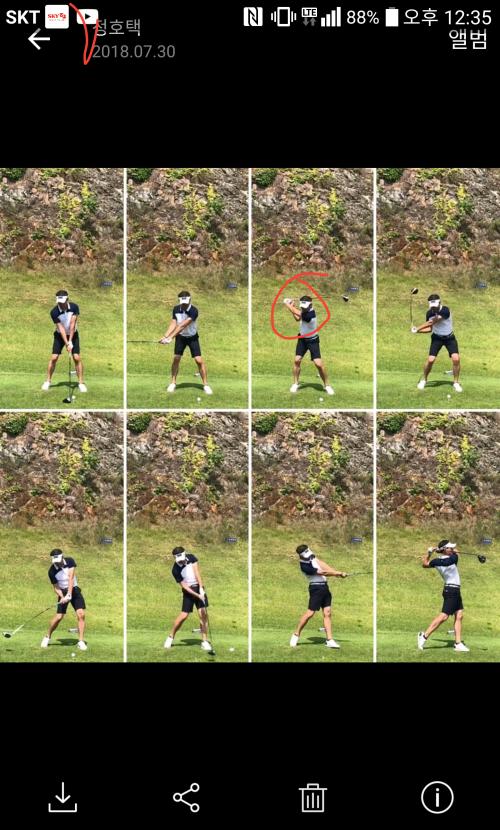 일단 동그라미 쳐진 사진은 백스윙 탑이 아니라 다운스윙이 시작된 다음으로 보입니다. 그래서 팔꿈치가 몸에 붙어 있는게 더 잘보이는 것 같구요....