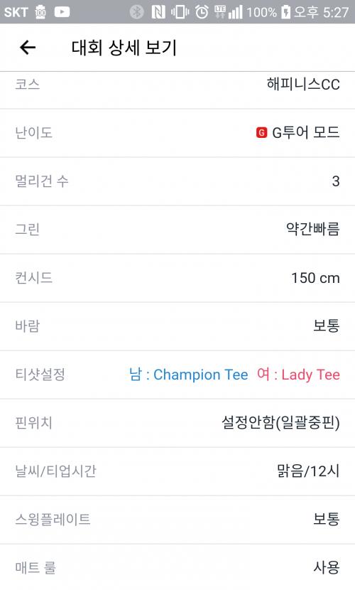 오늘 골포 대회 쳐봤는데, 해피니스 챔티는 좀 많이 길다라는 느낌을 받았습니다. 요즘 그렇잖아도 짤순이 되었는데, 허덕거리며 쳤네요. 하지만 아직 많이들 안치셔서 순위권 입성~! ㅎ | ||