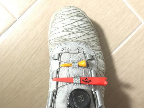 주머니에도 몇번 넣어 봤지만 카트 앉거나 퍼팅 라이 볼때 주머니에서 찔리고 흙이 묻어나서 안좋아 혹시나 하고 꽂아보니 신발 끈 구멍에 딱 들어갑니다.