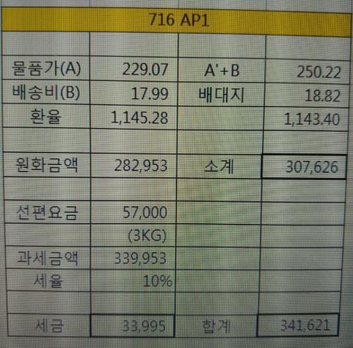 왼쪽줄이 세금(관세,부가세) 계산인데요.