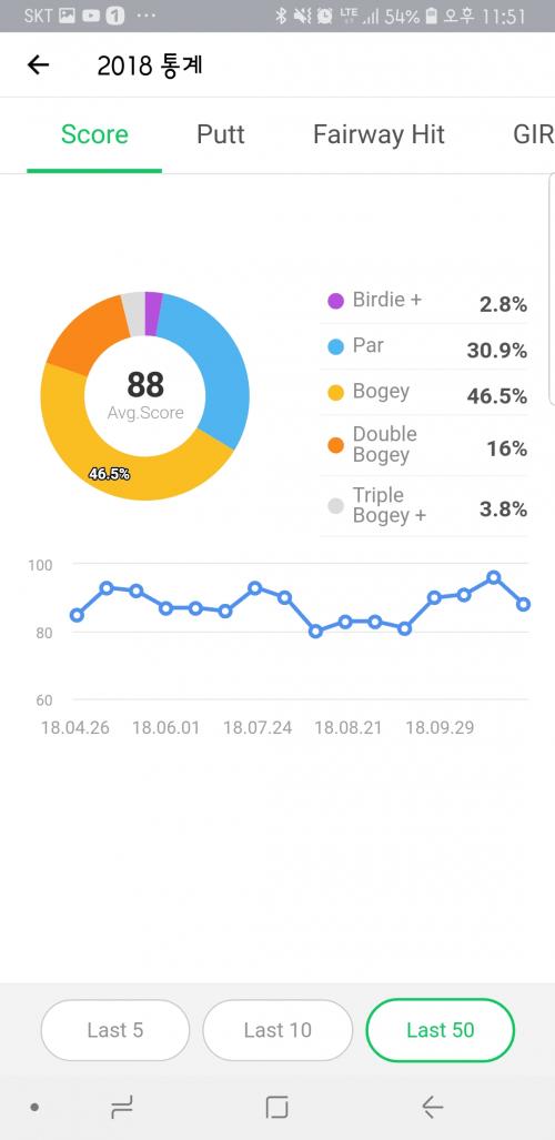 총 18라운드. 버디 2.8%, 파 30.9%, 보기 46.5% 네요.