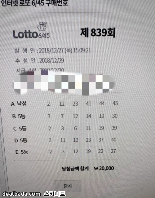 헐 5등이 4개... 고정번호 3개가 당첨번호였나보네요 ㅋ | ||