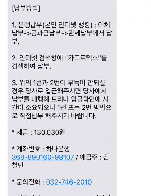 원산지 증명서를 제출하였고, 오늘 13만원을 내라고 메시지가 왔네요.