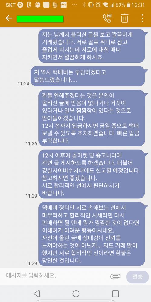 택배 거래란 믿고 거래하는 것인데, 허위 정보를 올려서 구매자를 속이고, 이에 구매자가 환불을 요청하니 무응답으로 일관하는 사람은 골프를 사랑하는 사람으로서 매너가 없다고 생각합니다.