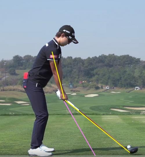 테이크백 때 굽혀진 손목을 오히려 다시 펴더라고요.(분홍색 선)