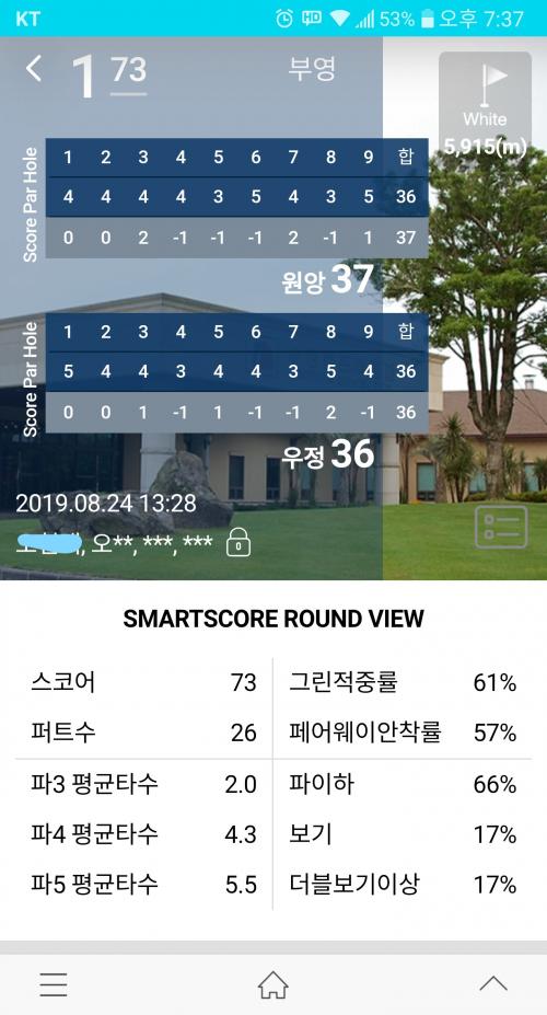 첫홀부터 드라이버 해져드 빠진후 10미터 파펏을 넣기 시작하더니 전반 마지막 홀은 오비까고도 15미터 내리막 펏을 원펏으로 보기, 다시 후반 첫홀 해져드 빠진후 파, 8번의 버디펏도 1~2미터 펏은 2번 정도이고 10미터 이상펏도 2번정도 성공하는등 총 퍼트수가 26개네요..ㄷㄷㄷ(버디 노리다 쓰리펏 한번이 아쉽..)