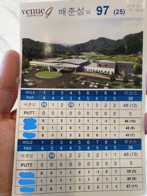 베뉴지가 페어웨이가 좁고 구블구불해서 많이 죽었습니다 다행히 전부 해저드라 스코어는 나름 유지!