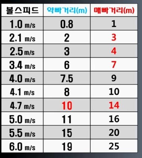 2.1일때 3.3m/s 때리니가 6.9미터 가네요. 3.4는 7미터. 저 표 기준으로 매빠는 2.1하면 될듯.. 2.1도 느린 느낌이었는데. 1.8로 내려야 되나... 흠.. | ||