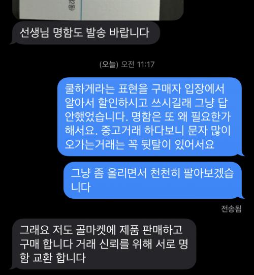 어제 새벽에 판매되었냐고 문의와서 안필렸다하니 아침에 문자준디더만 아침에 뜬금없이 알아서 금액 깎으시고는 쿨거래하자고 명함보내고 저보고도 보내라는군요.