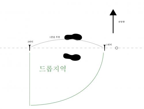 3. 1번티와 2번티 직선의 후방 반원 사이에 드롭합니다.