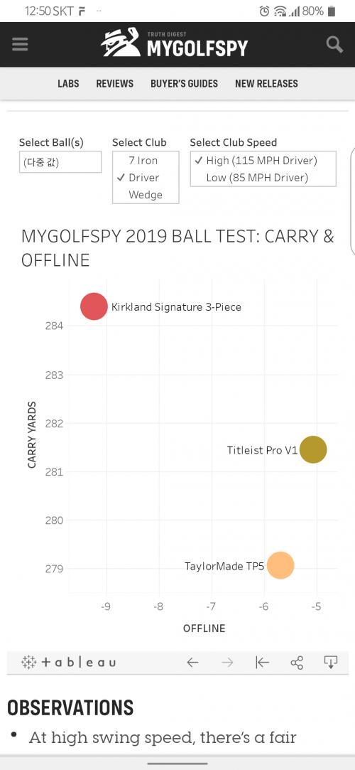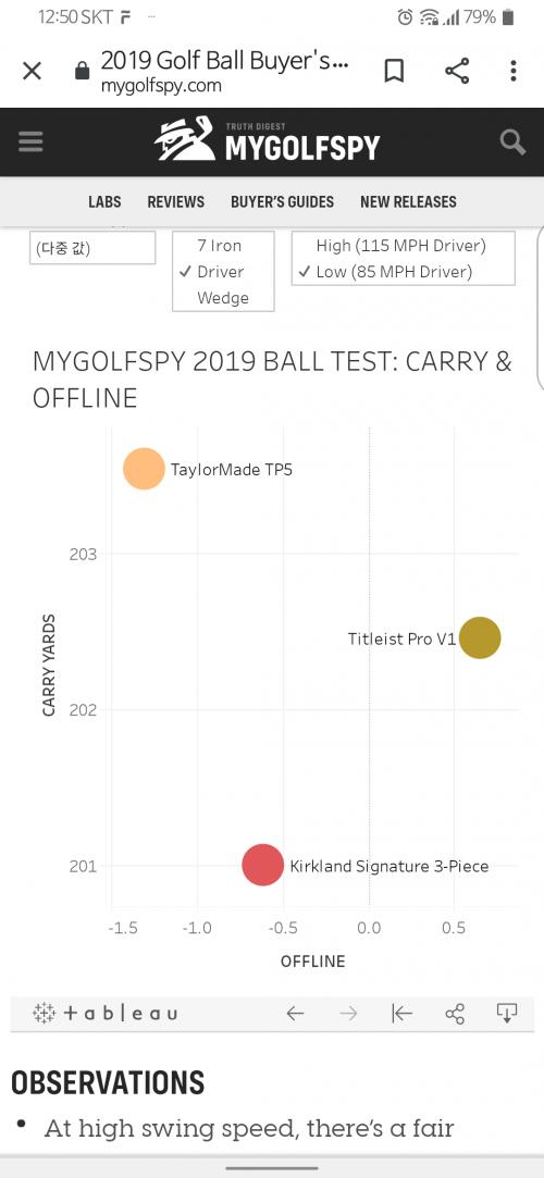 위의 그림은 마이골프스파이에서 분석한 볼리뷰인데 제가 쓰던 tp5와 pro v1 그리고 코스트코볼만 선택해서 찾아본겁니다.