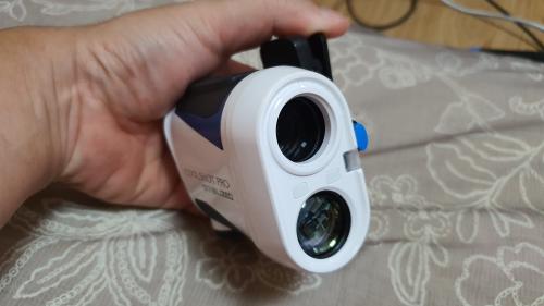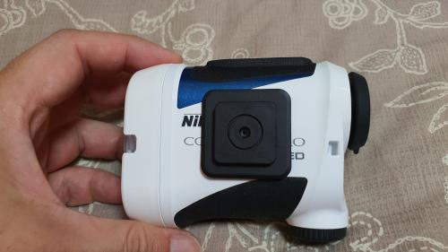 거리측정기를 이렇게 렌즈가 앞을 보게 장착하면 저 파란 버튼을 누르기 어려워요