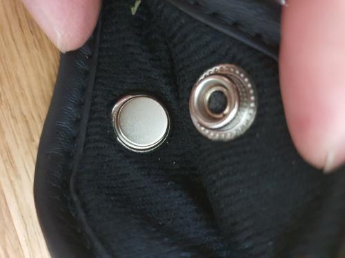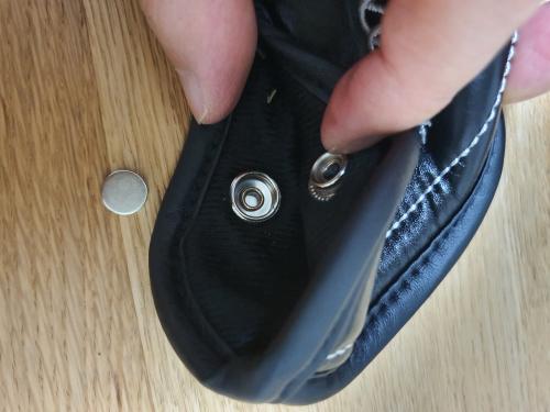 저도 다른분들 작업하신 글보고 영감을 얻어 작업해 보았습니다. 똑딱이 단추가 잘 안빠지는 경우가 많았는데 사진과 같이 큰 똑딱이 단추에 자석을 본드로 붙였더니 훌륭한 자석커버가 되었습니다. 작업도 어렵지 않고 자석 힘도 그럭저럭 좋네요.