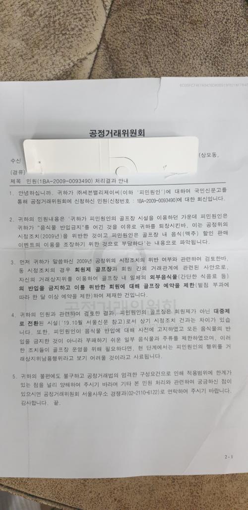 의견: 해당 조사관에게 골프장의 바가지요금에 대한 부분이 타당하다고 보냐등의 항의도 하고 많은 이야기를 나눴지만 그런부분들은 이 건과는 다른 형태의 문제제기를 해야 된다는등 여러모로 아쉬움이 많이 남네요. 골프장에서 공지만 하면 자신들이 판매하는(카트에까지 제공되는)음식은 문제없고 고객이 갖고오는 음식은 금지해도 된다는 것은 여전히 납득이 어렵네요.