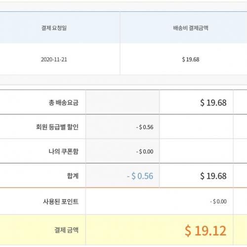 부피무게 맞았고, 19.68불, 회원등급 할인으로 최종 19.12불 나왔네요
