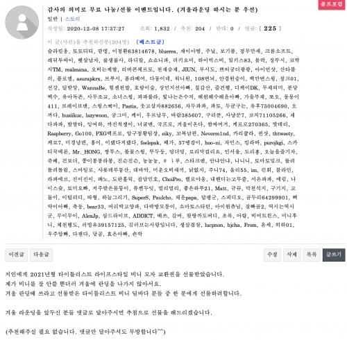 두 분은 이 글을 보시면 쪽지로 연락처 알려주세요~ 비니 선물 교환권 보내드리도록 하겠습니다.