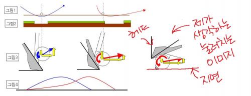 아래사진은 왼쪽 파란색의 잘못된 다운블로(V자 찍기, 스쿠핑), 가운데는 빨간색이 정확한 다운블로 이미지, , 오른쪽 그림은 제가 생각하는 헤드로 눌러치는 매우 과장된 이미지