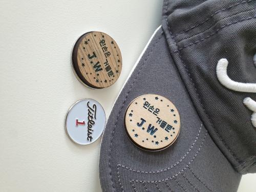 나무재질이라 특이하면서 고급스럽고 예쁩니다. 밑에 금속판이 붙어있어서 자석 클립에 붙일 수도 있습니다. 타이틀리스트 자석 모자에 붙여보았다니 매우 잘 붙습니다.