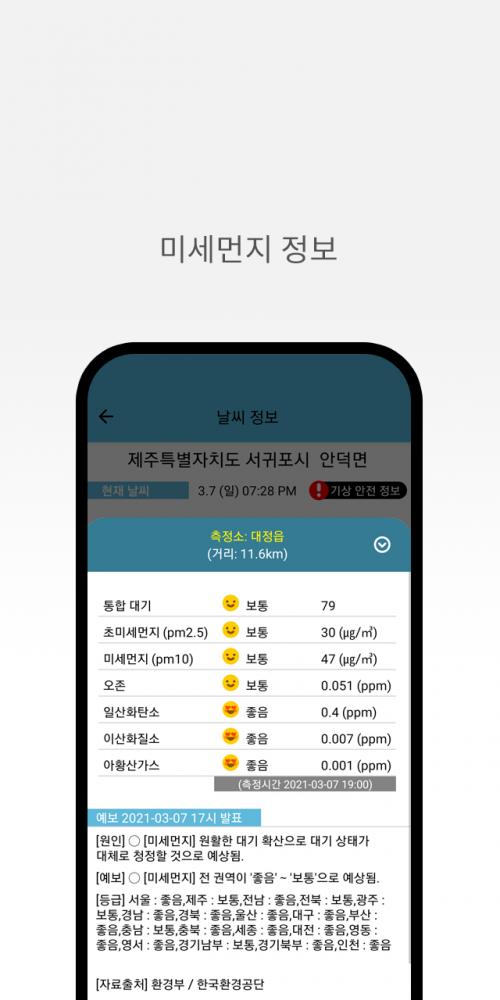 주소에 기반해서 날씨 데이터를 가져오는 방식으로 현재+시간별 예보는 더 위치에 맞는 예보를 전달합니다. ex) 같은 애월읍이어도 중산간, 해안쪽의 예보가 다릅니다.