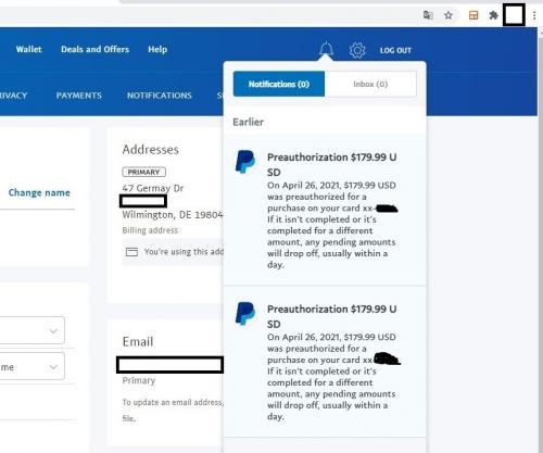 "On April 26, 2021, $179.99 USD was preauthorized for a purchase on your card xx-3451. If it isn’t completed or it’s completed for a different amount, any pending amounts will drop off, usually within a day."