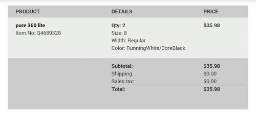 당시 아디다스 공홈 기본 20% 적용하구요. 쿠폰 20% + 쿠폰 25% 해서 한 컬레당 18달러 안되게 구입했습니다 ㅋ 36달러정도에 2컬레면 괜찮은 딜이죠? ㅎㅎ