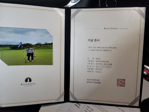 티박스에서 내리막이 심한 파5 투온 이글이라 증서를 안줄거라고 생각했는데, 증서까지 받게 되서 기분이 더 좋습니다.